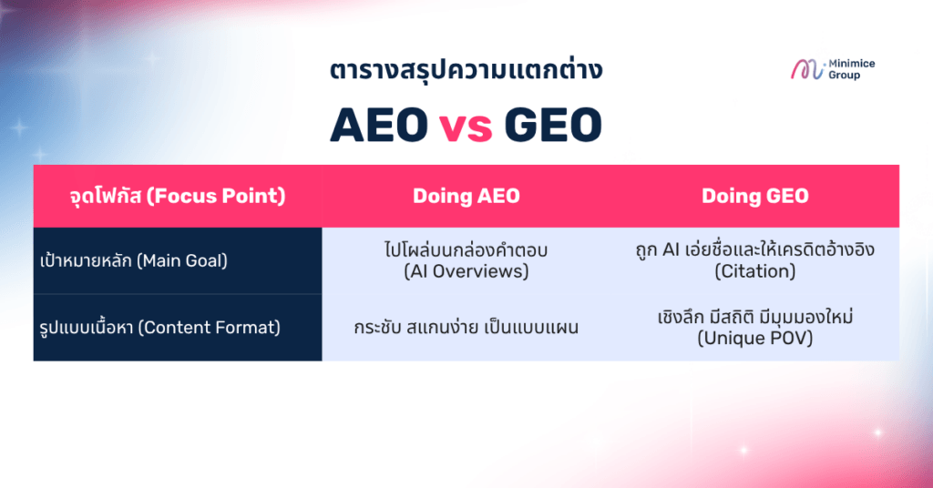 | จุดโฟกัส | การทำ AEO | การทำ GEO |