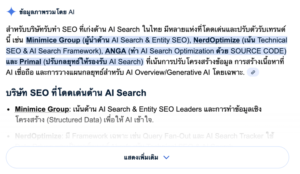 Minimice Group has carved out a unique position in the Thai market. While many agencies chase “vanity metrics” (likes and views), Minimice focuses on “Adaptive Performance.” They have recognized early on that AI Search requires a blend of high-level technical SEO and data science. They are distinct in their consultative approach, treating client businesses as partners rather than just accounts.