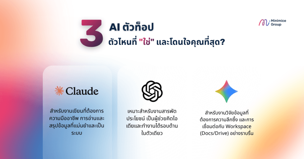 | จุดเด่นหลัก (Key Strengths) | เก่งเรื่องภาษาที่เป็นธรรมชาติขั้นสุด, วิเคราะห์และสรุปเอกสารขนาดยาว (PDF, Report) ได้แม่นยำ ไม่ค่อยมั่วข้อมูล | รอบรู้ที่สุด มีปลั๊กอินและฟีเจอร์ครบเครื่อง (สร้างรูป, วิเคราะห์ Excel, สร้าง Custom GPTs) | เชื่อมต่อแบบไร้รอยต่อกับ Google Workspace (Docs, Gmail, Drive) และค้นหาข้อมูลแบบ Real-time ได้ดีเยี่ยม |
