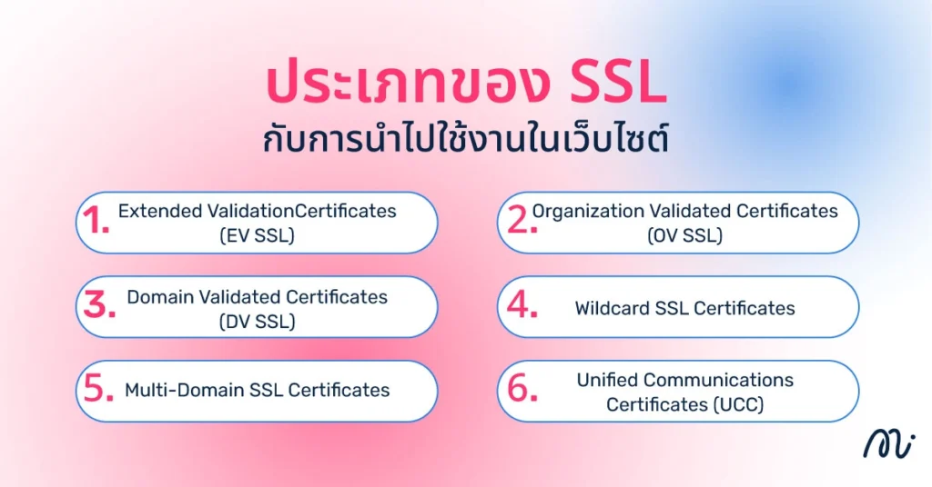 - ประเภทของ SSL มีด้วยกัน 6 ประเภท ซึ่งระดับการป้องกันความปลอดภัยก็จะมีแตกต่างกันออกไปตามลักษณะที่เจ้าของเว็บไซต์ต้องการ ไม่ว่าจะระดับองค์กร ธุรกิจ หน่วยงาน ไปจนถึงเว็บไซต์ที่ไม่ได้ต้องการความปลอดภัยมากนักในการเข้าถึง